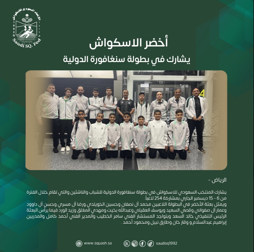 يشارك منتخبنا في بطولة سنغافورة الدولية للشباب والناشئين خلال 6–15 ديسمبر، بمشاركة 254 لاعبًا.