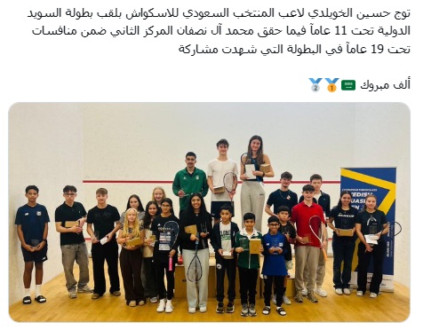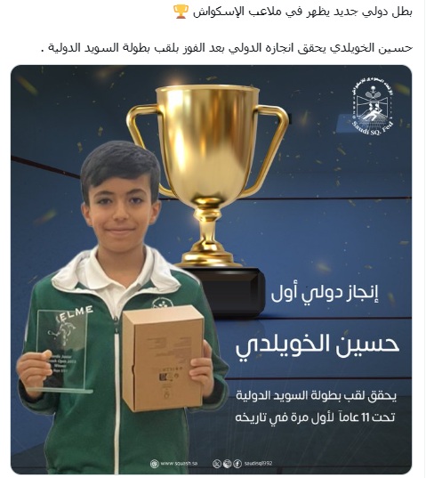 تتويج حسين الخويلدي لاعب المنتخب السعودي للاسكواش بلقب بطولة السويد الدولية تحت 11 عامآ